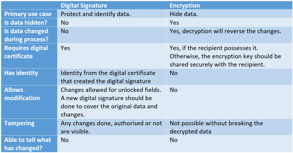 Reference table on the differences between Digital Signatures and Encryption.